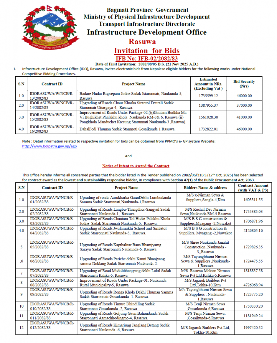 तस्बिर : बोलपत्र आह्वानको लागि र बोलपत्र स्वीकृत गर्ने आशयको सूचना