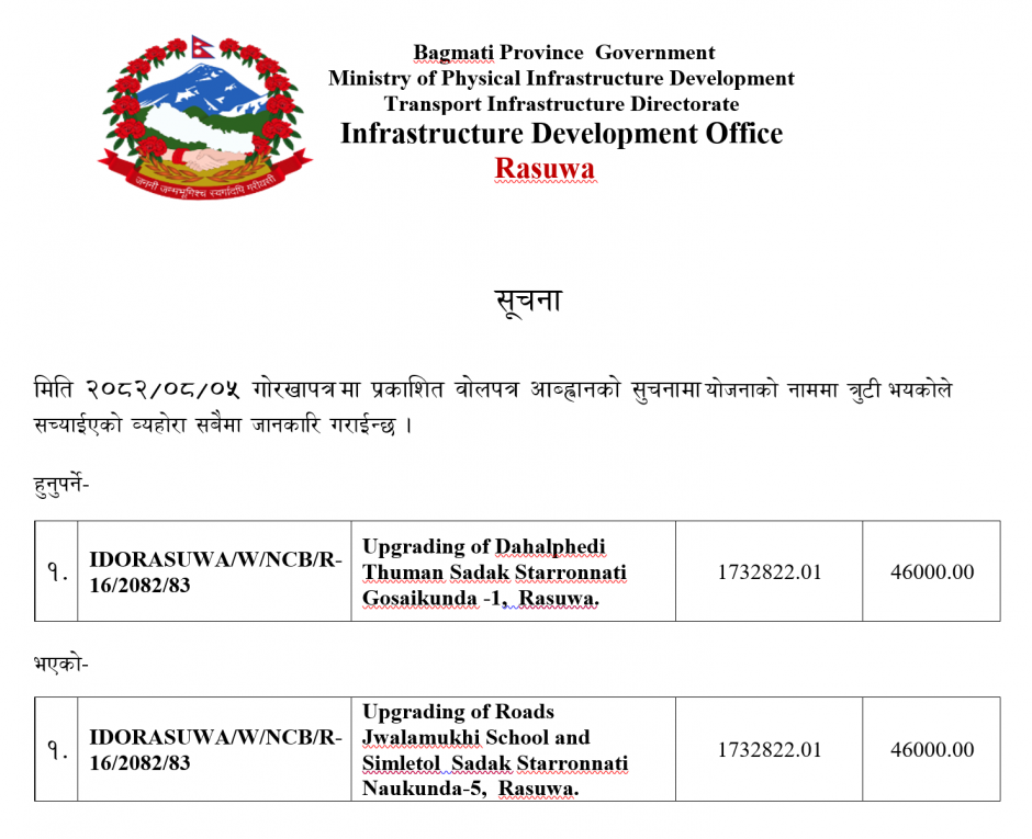 बोलपत्र आह्वानको लागि र बोलपत्र स्वीकृत गर्ने आशयको सूचना